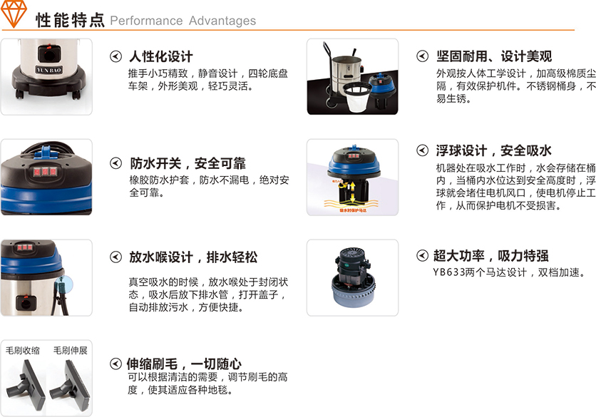 適用范圍:采用輕巧的不銹鋼桶身設計,真空吸力超強,專(zhuān)為相對干凈的區域吸塵吸水作業(yè)而設計,適用于賓館酒店、工廠(chǎng)、商店和醫院等環(huán)境的清潔工作。